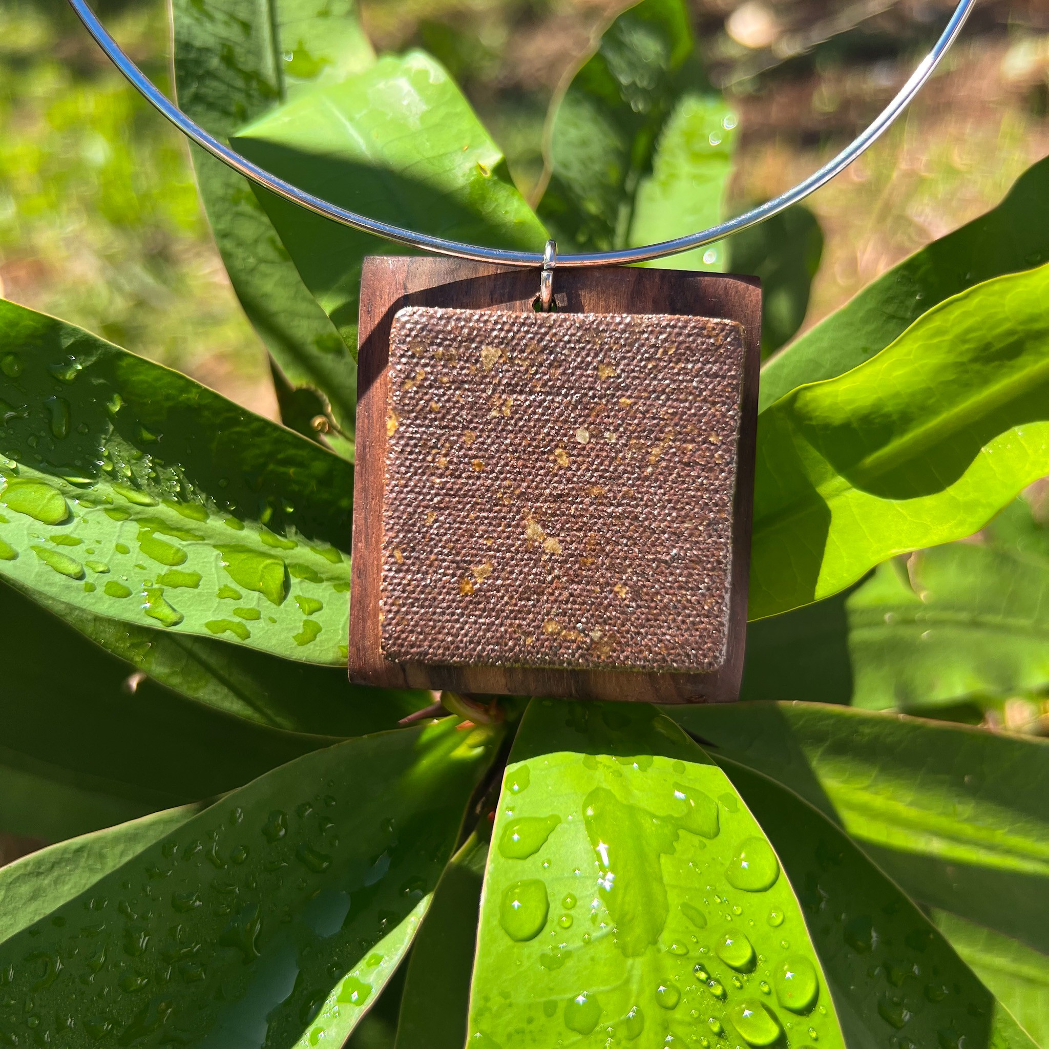 Colar de aro em aço inox com pingente quadrado de cerâmica sem esmalte, apenas com o efeito da cinza e do fogo, conferindo à peça um efeito natural e um toque de rusticidade. O pingente contém a junção da cerâmica com madeira.